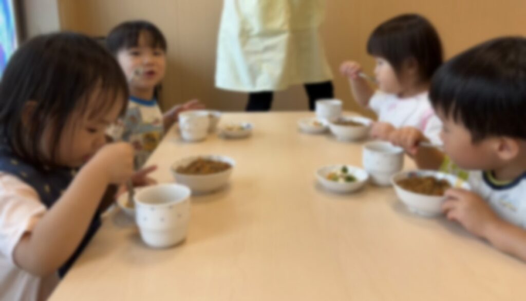 本園は自園調理です。出来立てのおいしいごはんを皆で一緒に食べています。